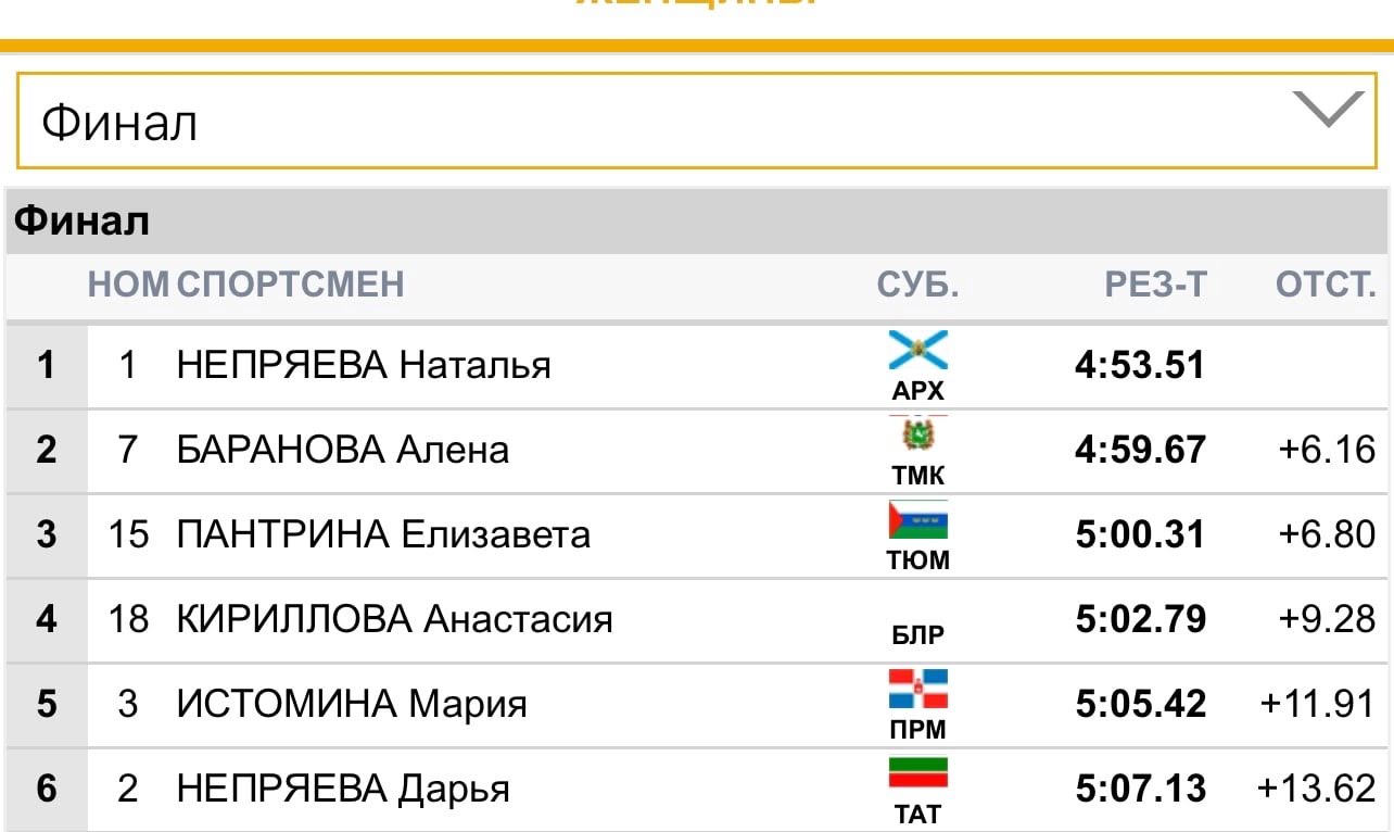 Среди женщин победу одержали Наталья Непряева, второе место заняла Алена Баранова, третье место заняла Елизавета Пантрина.