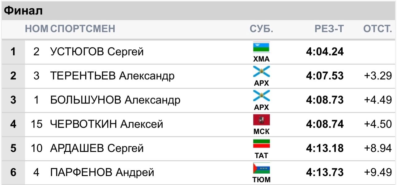 Среди мужчин победу одержал Сергей Устюгов, второе место занял Александр Терентьев, третье место занял Александр Большунов.