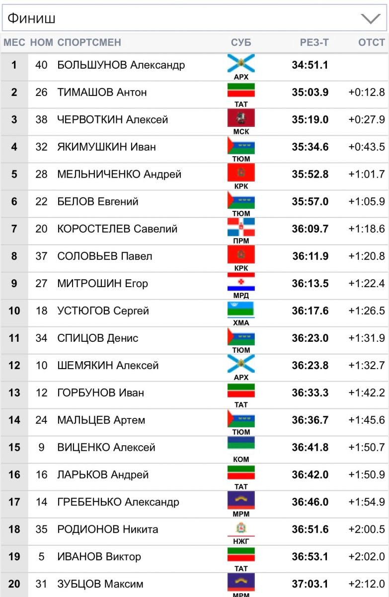 Среди мужчин победу одержал Александр Большунов, второе место занял Антон Тимашов, третье место занял Алексей Червоткин.