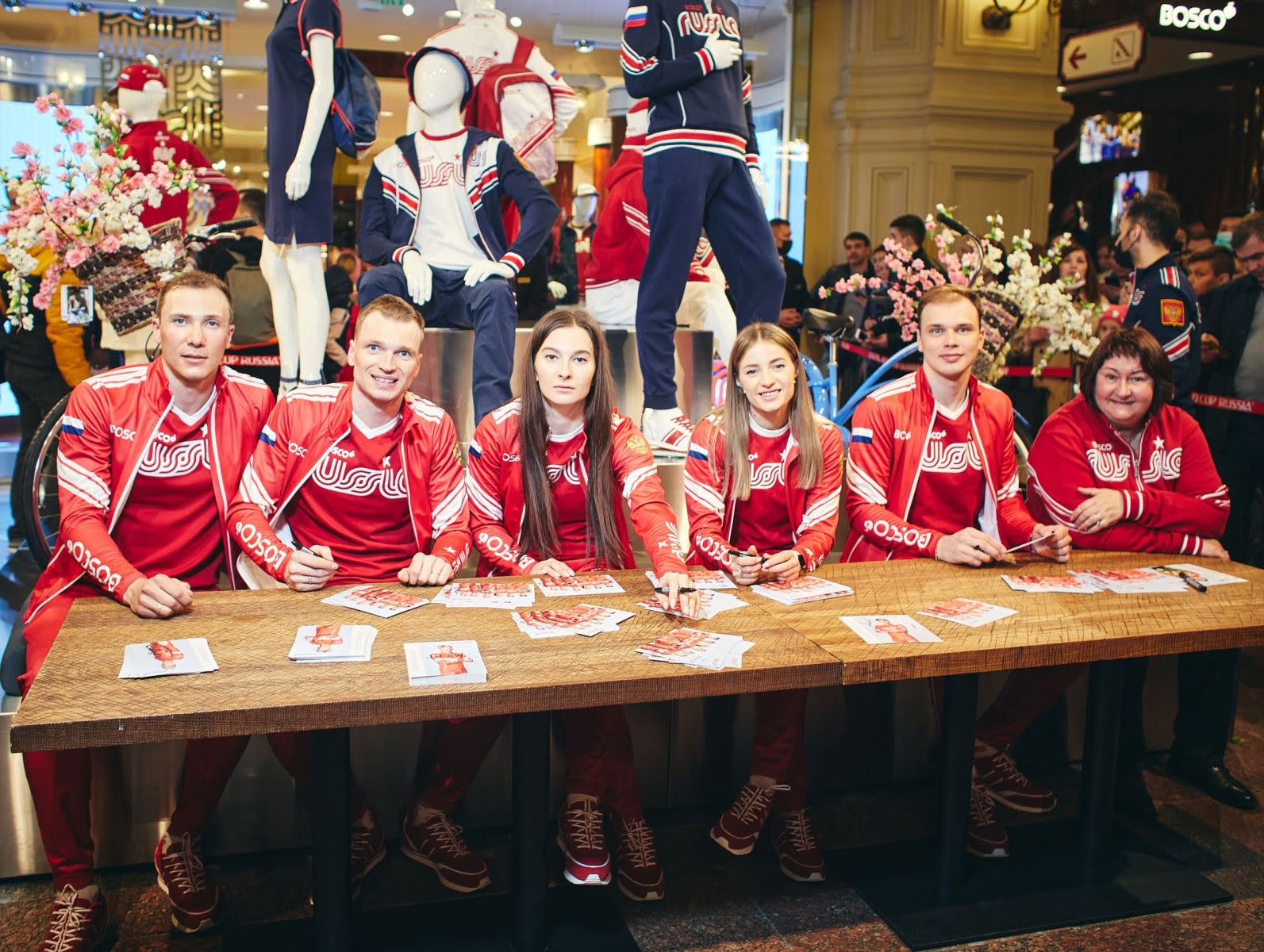 В этот вечер Bosco и ФЛГР пригласили всех поклонников лыжного спорта встретиться с любимыми спортсменами. Александр Большунов, Наталья Непряева, Глеб Ретивых, Иван Якимушкин, Яна Кирпичнко, Артём Мальцев и Елена Вяльбе раздавали автографы и фотографировались с поклонниками. Александр Большунов, чемпион мира по скиатлону 2021, привез в ГУМ свои награды – медали и Хрустальный глобус.