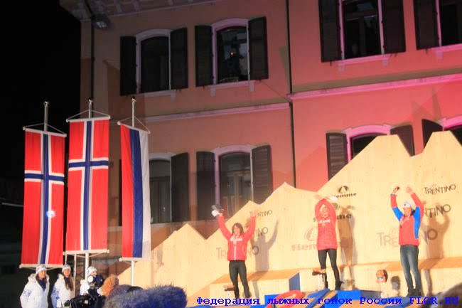 Только что прозвучал гимн Норвегии. Толпа приветствует победителя и призеров гонки.