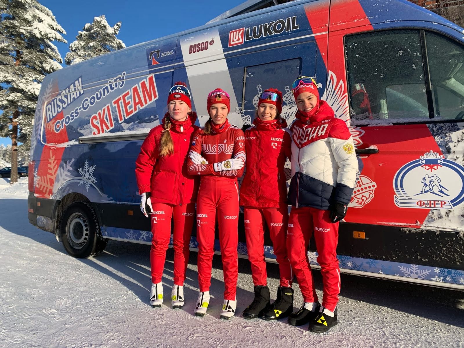 Российские юниоры финишируют четвертыми в эстафете 4 по 5 км. Первое место у Норвегии, Второе место Финляндия, третье место Италия.