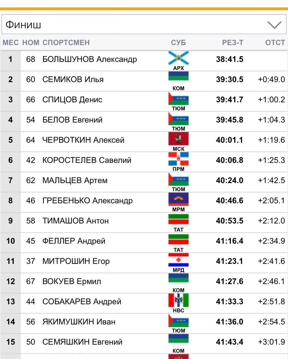 Среди мужчин победу одержал Александр Большунов, второе место занял Илья Семиков, третье место занял Денис Спицов.