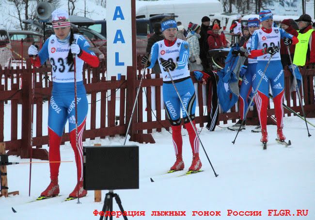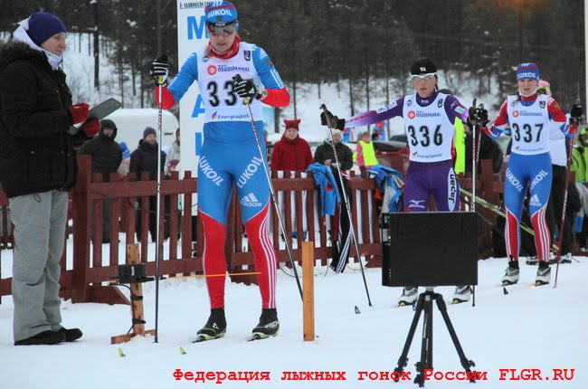 Старт женской гонки на 5 километров, 332 номер - Ярослава Черданцева (Алтайский край/ЯНАО), следом за ней Светлана Николаева (Архангельская область), следом Екатерина Воронцова (Тюменская область).