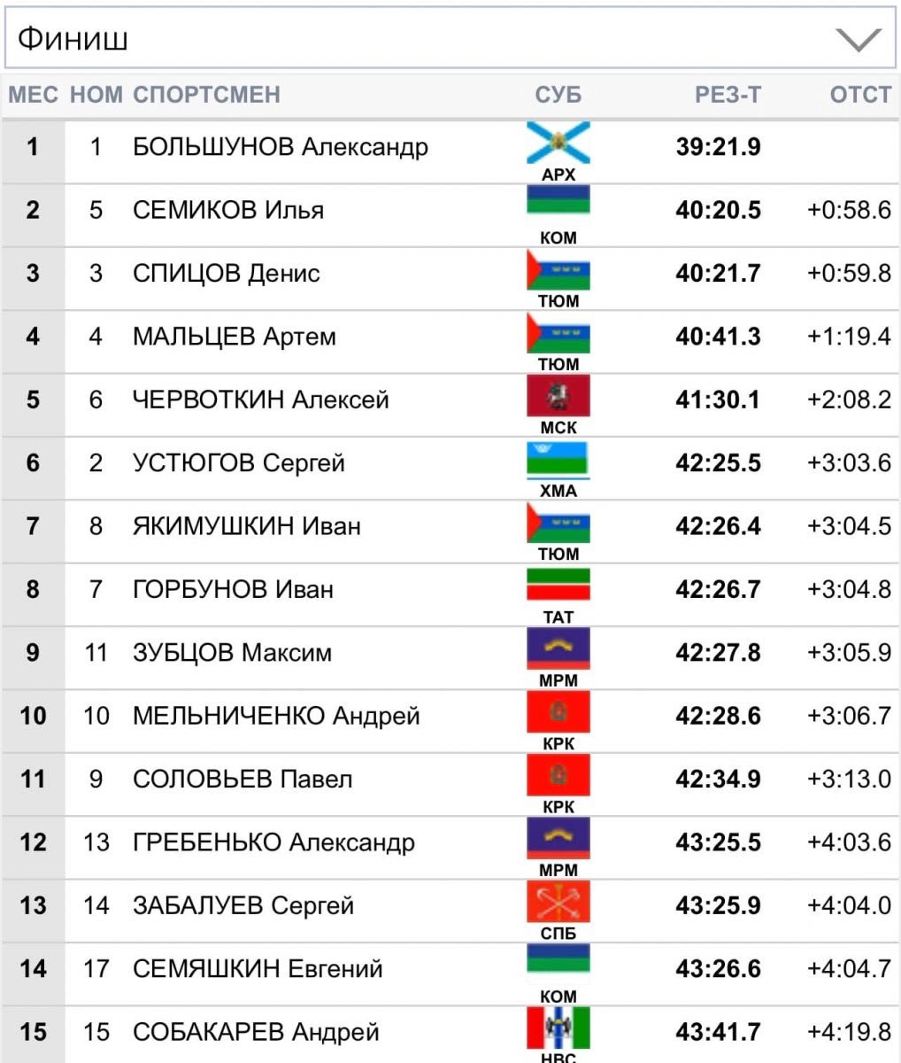 Среди мужчин победу одержал Александр Большунов, второе место занял Илья Семиков,третьим финишировал Денис Спицов.