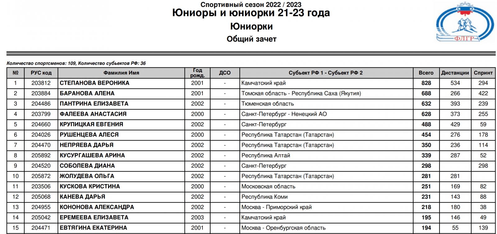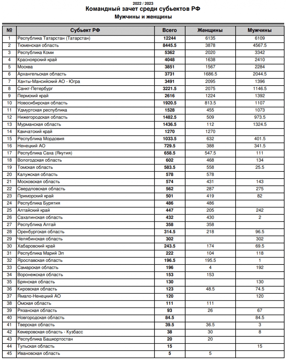 Командный зачет среди субъектов РФ.