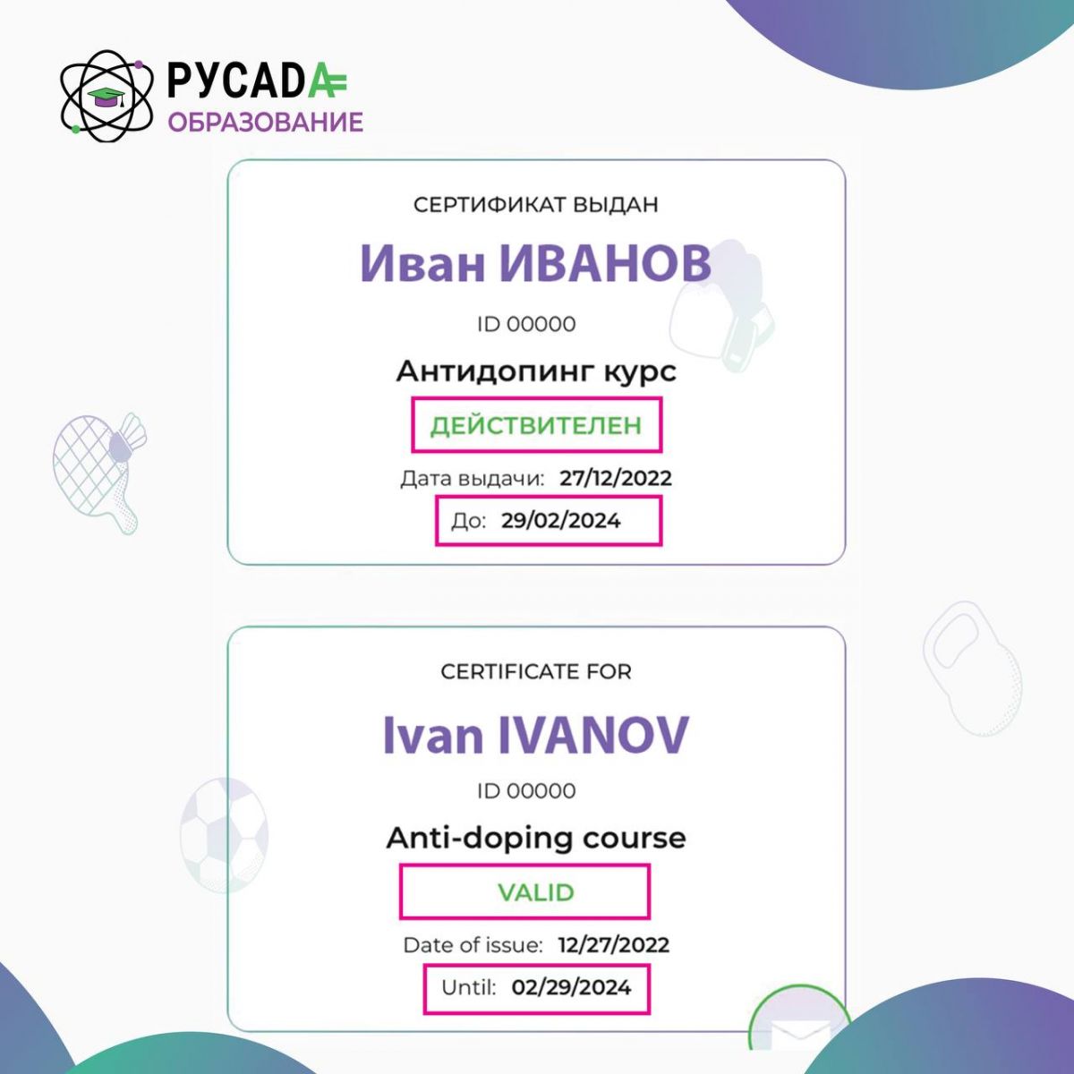 Напоминаем, что для удобства пользователей образовательного портала РУСАДА срок действия сертификатов, выданных в 2023 году, продлен.