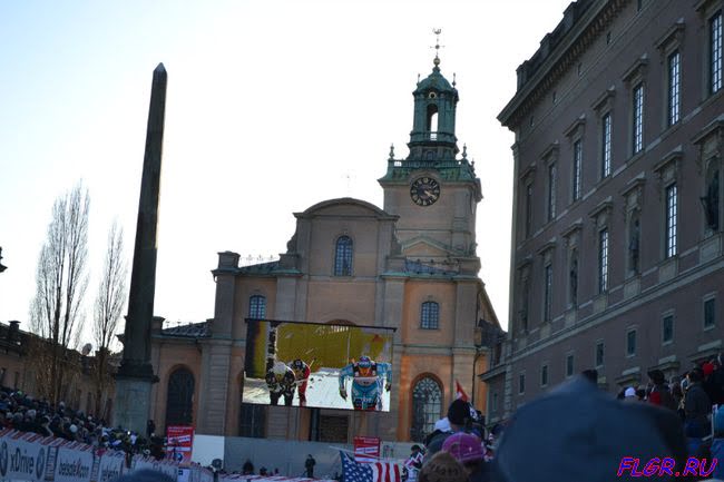 Огромный экран, установленный на финише, показывал прямую трансляцию с гонки
