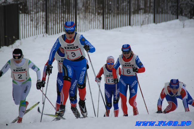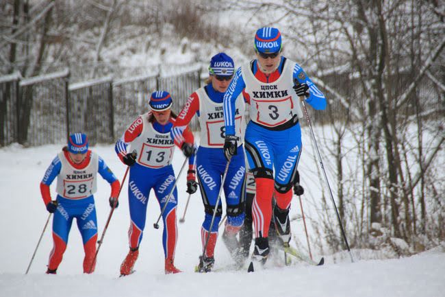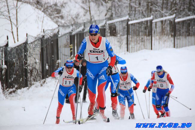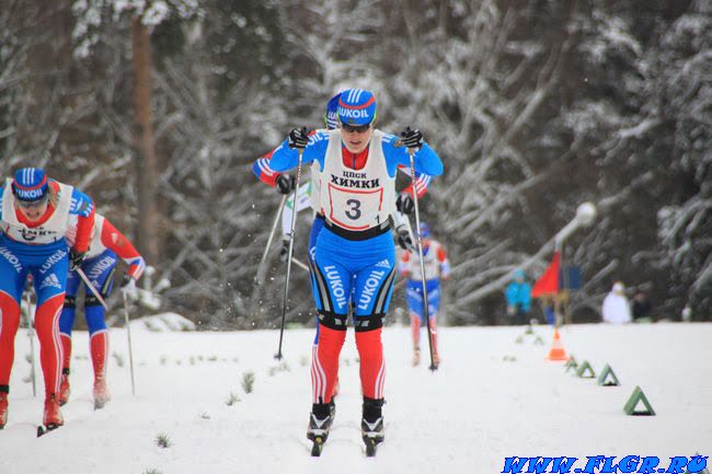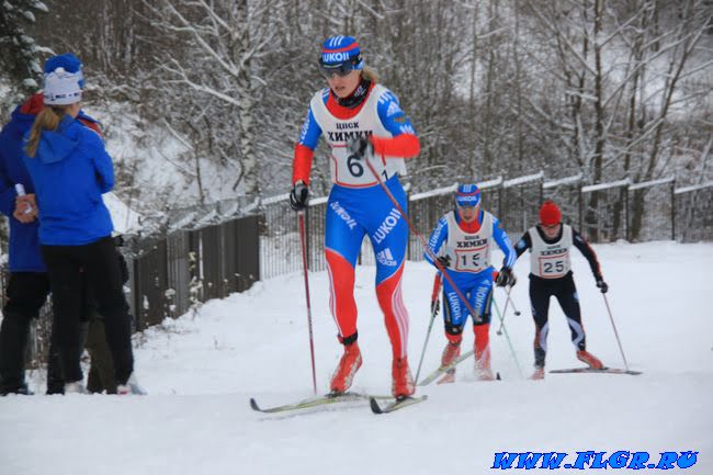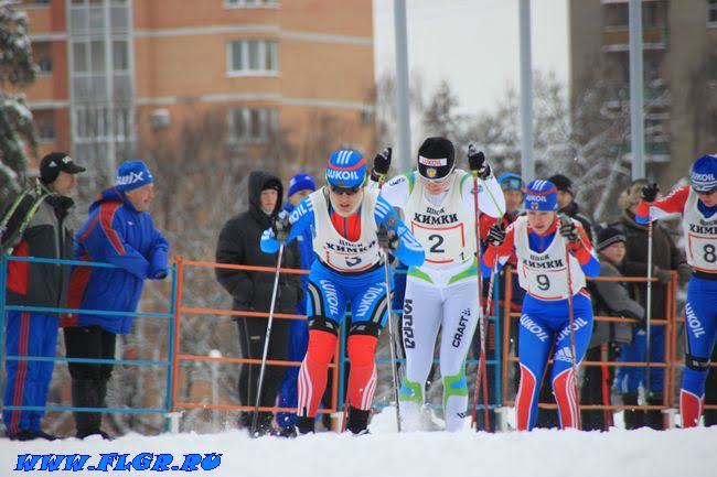 Наталья Матвеева уверенно мчится к финишу. 11 номер Наталья Коростелева и 10 номер Юлия Тихонова стараются не отставать