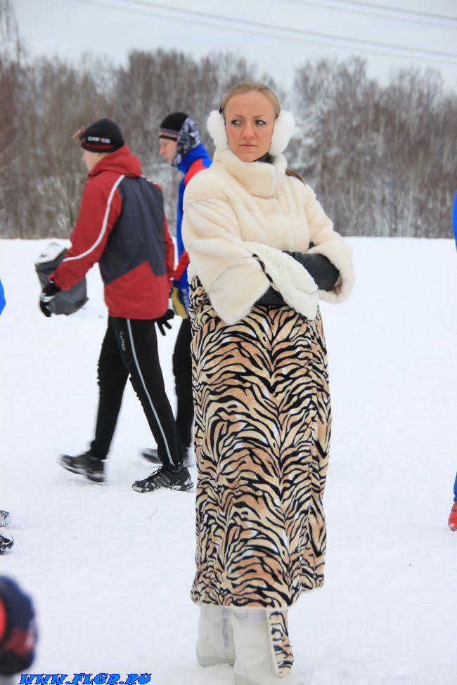 Помимо общей массы людей в спортивной одежде выделялась и одна болельщица по имени Дарья в меховой накидке и теплых валенках