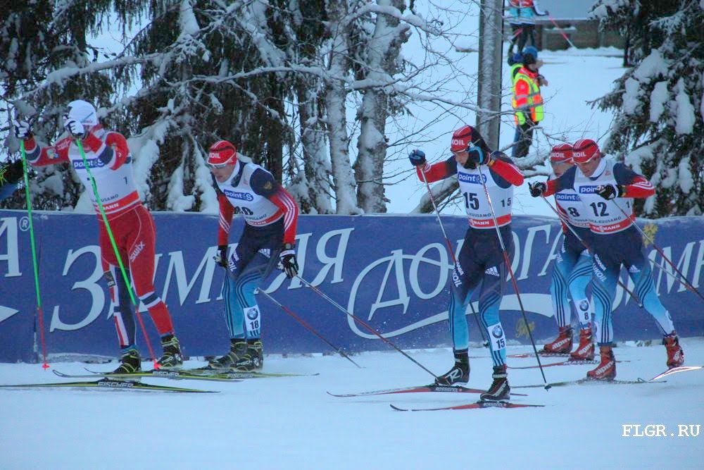 Через два круга после старта сильнейшие лыжники подтянулись к лидерам, и началась позиционная борьба – никто не хотел постоянно вести пелетон. На заключительных 2.5 километрах Александр Легков вышел вперед на подъеме и стал наращивать темп, который смогли поддержать лишь Максим Вылегжанин и Мартин Сюндби из Норвегии.