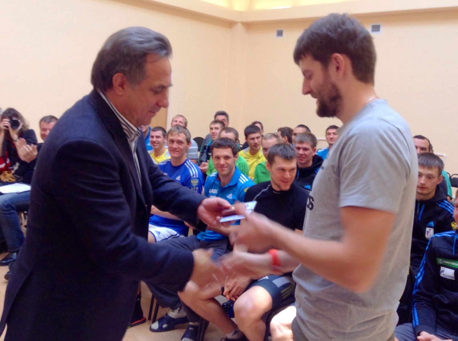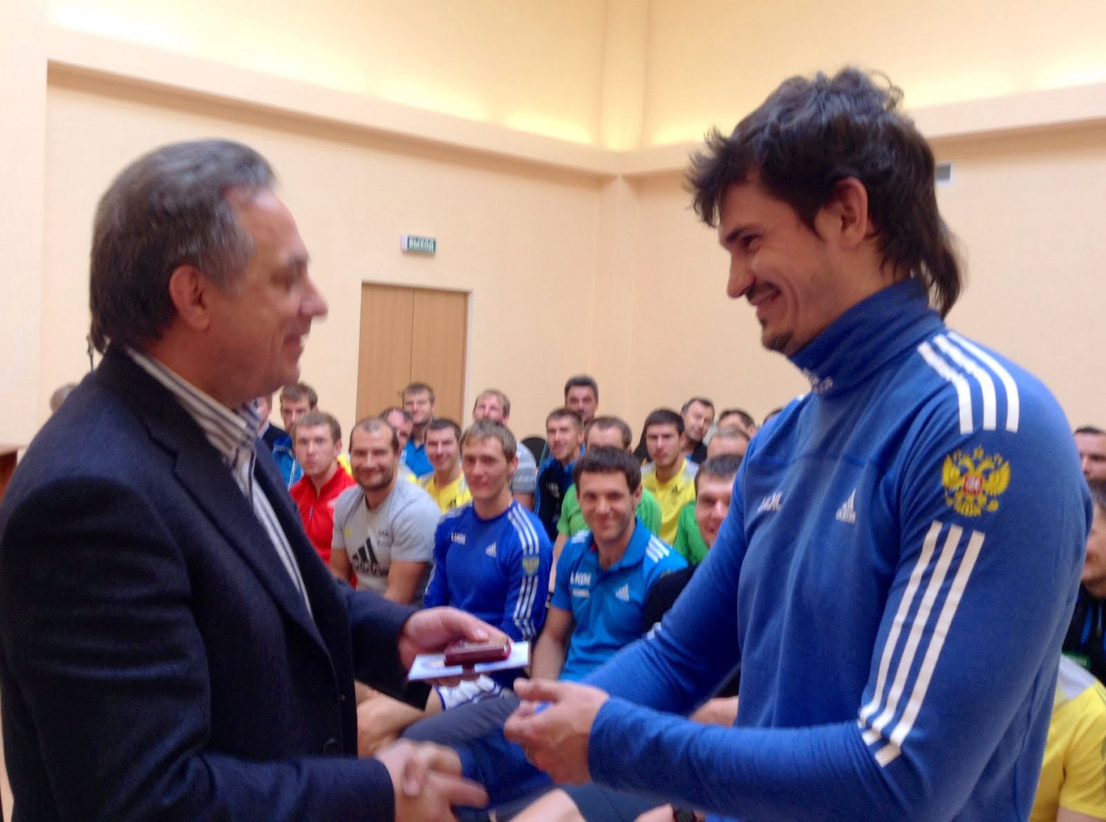 Несколько дней назад Министр спорта Российской Федерации Виталий Леонтьевич Мутко посетил спортсменов и в торжественной обстановке вручил сервисменам спринтерского состава сборной команды России по лыжным гонкам ведомственный нагрудный знак «Отличник физической культуры и спорта». Награды удостоились: Головин Виктор, Ленский Владимир, Пирогов Дмитрий и Рысин Владимир.