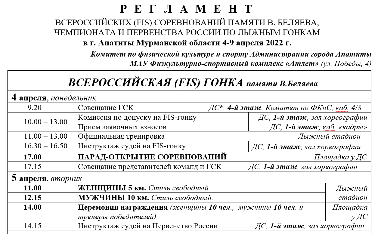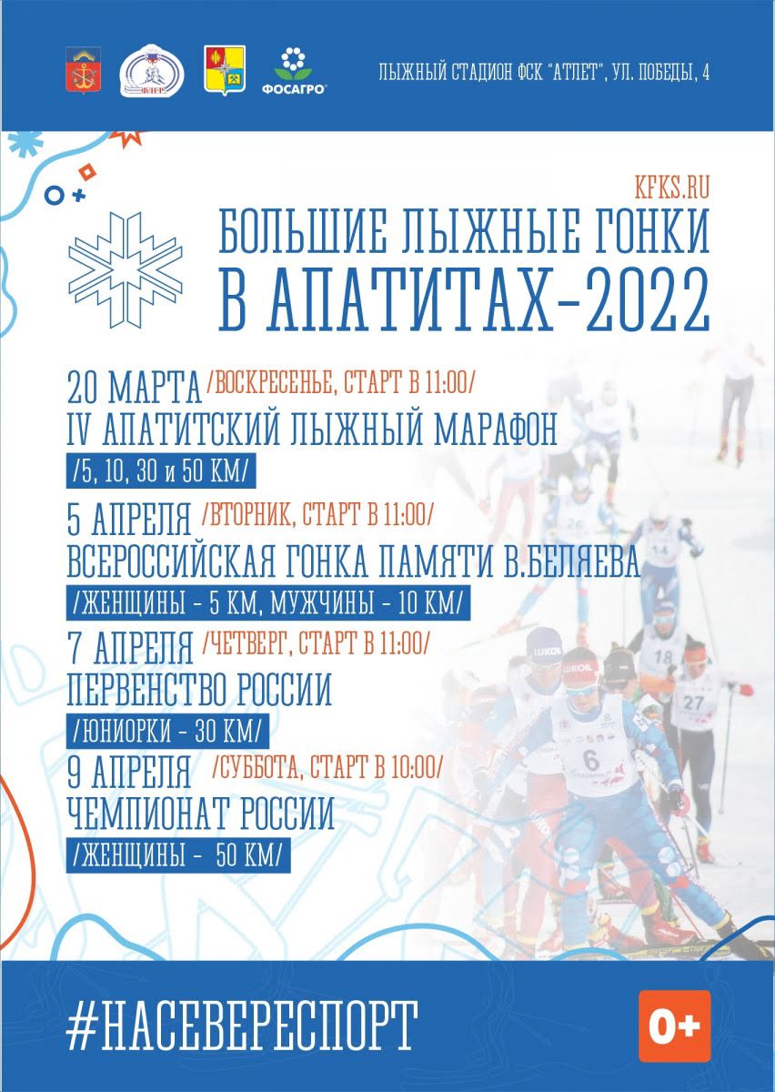 С 4 по 9 апреля 2022 год в городе Апатиты Мурманской области на лыжном стадионе Физкультурно-спортивного комплекса «Атлет» (ул. Победы, д. 4) состоятся главные для этого заполярного города спортивные мероприятия: Всероссийская лыжная гонка памяти Владимира Беляева, Чемпионат России и Первенство России – необыкновенные по красоте лыжные гонки среди женщин и юниорок на дистанциях 50 и 30 километров.