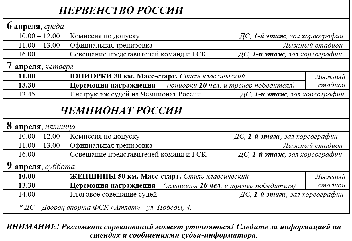 9 апреля (суббота) пройдет Чемпионат России – соревнования среди женщин на дистанции 50 км свободным стилем.