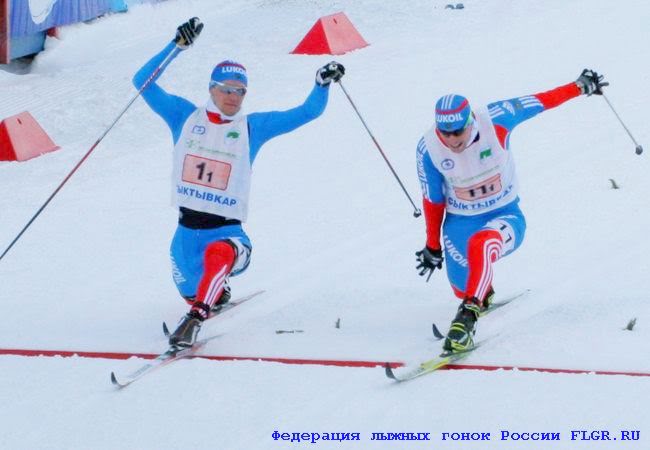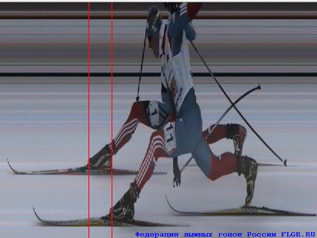 Первым из подъема вышел Крюков, Устюгов следом. Через несколько десятков метров югорский лыжник вышел на параллельную лыжню. Итогом стал следующий кадр. Никита лишь на несколько сотых секунды опережает Сергея.