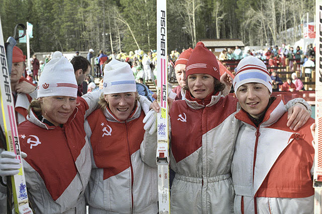Чемпионки XV Олимпийских зимних игр в Калгари 1988 года. Эстафета 4×5 км Анфиса Резцова, Тамара Тихонова, Светлана Нагейкина и Нина Гаврилюк.