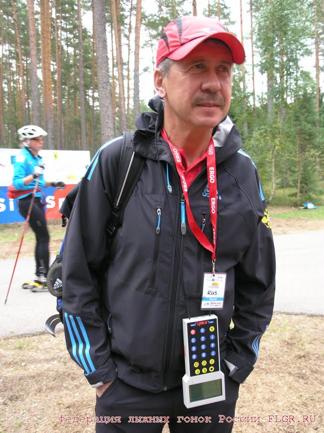 Старший тренер спринтерского состава Михаил Девятьяров (Московская область) со специальным устройством, позволяющим высчитывать время спортсмена во время гонки, подсказывая о выигрыше или проигрыше.