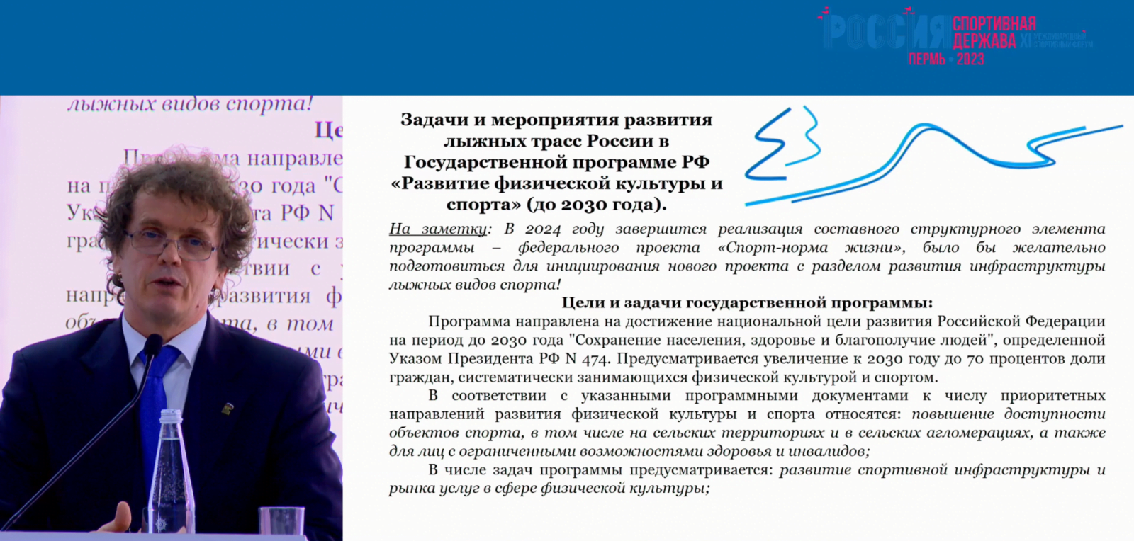 В подготовленном докладе о лыжной инфраструктуре России в системе государственного и негосударственного развития физической культуры и спорта Председатель Комиссии по спортивной политике Соцплатформы ВПП «Единая Россия», Председатель Исполкома ООД «Лыжные трассы России», член Комитета ТПП РФ по предпринимательству в сфере спорта Андрей Михайлович Беликов озвучил следующие тезисы: «Лыжным видам спорта необходимо развиваться с динамикой, позволяющей всей сфере физической культуры и спорта РФ достигнуть целей национального плана развития России, определенных в Указе Президента РФ №474. Лыжная инфраструктура России, как объект приоритетного развития Стратегии развития физической культуры и спорта в РФ до 2030 года, должна обеспечивать динамику развития лыжных видов спорта, то есть развиваться в соответствии с планами, определенными в их программах развития. Сфера физической культуры и спорта, как предмет совместного ведения РФ и субъектов РФ неоднородна: множество государственных, муниципальных и негосударственных субъектов участвуют в ее развитии и работе, без согласованного плана и программ трудно говорить о каком-либо государственном управлении и содействии в этом процессе».