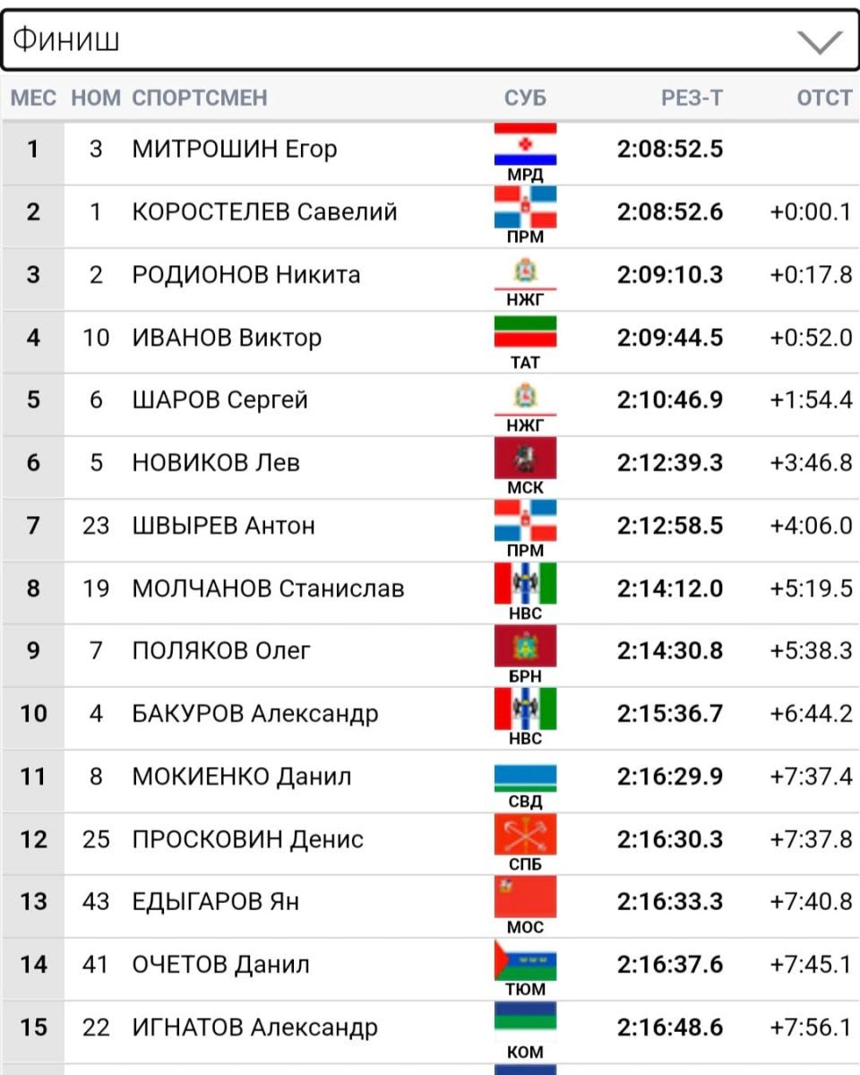 Победил Егор Митрошин (Республика Мордовия) 2.08.52.5, второе место у Савелия Коростелева (Пермский край) +0.1 секунды, третье место у Никиты Родионова (Нижегородская область) +17.8 секунды.