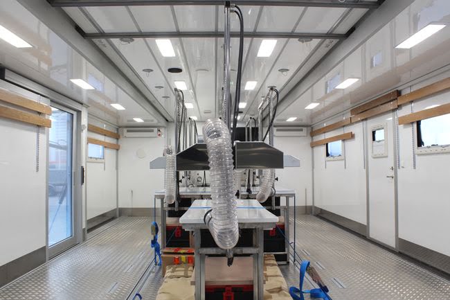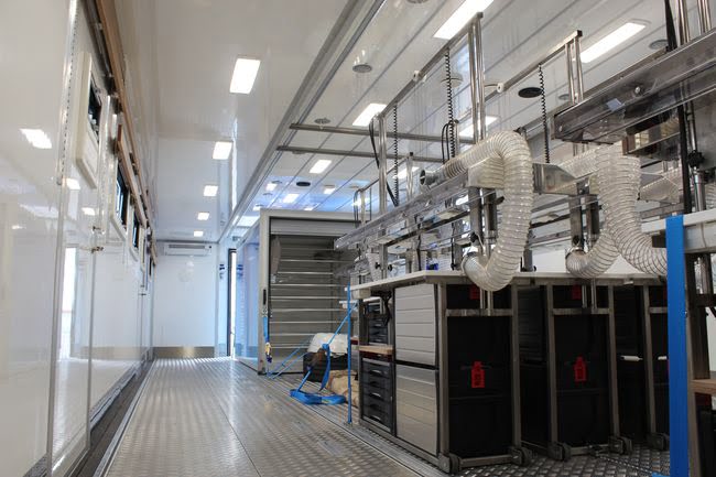 13,6-метровый полуприцеп, который является рабочим местом смазчиков, собран и полностью оборудован шведской компанией SKAB по специальному заказу. Внутри расположены семь столов для смазки лыж, каждый из которых разделен на два рабочих места. Соответственно, одновременно смогут работать 14 человек. У каждого смазчика предусмотрена индивидуальная подсветка рабочей зоны, источники электропитания и усиленная вентиляция для отвода ядовитых газов. Также в прицепе организовано центральное кондиционирование воздуха, подогрев, а также тепловые пушки над дверями. Рабочие столы закреплены на полу с помощью специальных замков, используемых в авиационной промышленности, таким образом, столы можно двигать в продольном направлении, оптимизируя рабочее пространство всего помещения.