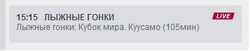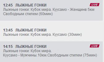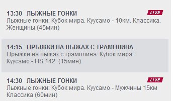 - 30.11 Пятница: Спринт. Телеканал Евроспорт в 15.15 по московскому времени (прямой эфир);