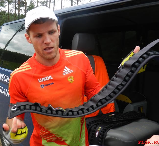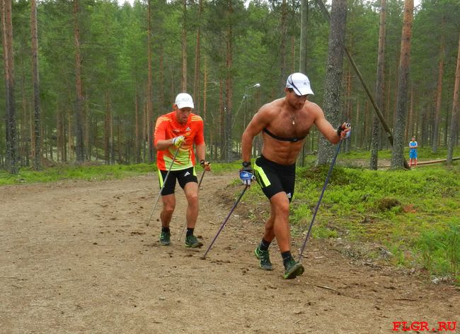 Имитация лыжного хода в сочетании с кроссом - основа летней подготовки. В перерывах между кругов работа на "резине". Алексей Петухов и Антон Гафаров.
