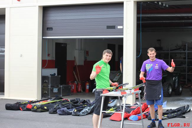 После завершения сезона все лыжи специально закрываются парафином, чтобы избежать иссыхания скользящей поверхности и дать лыжам "отдохнуть". Но в станок лыжа должна быть подана без парафина, поэтому на сбор выехала группа сервисменов, которая и занималась подготовкой лыж к станку. На фото Сергей Дергунов (Псковская область) и Александр Веселов (Ивановская область), на заднем плане чехлы спортсменов с лыжами для нанесения шлифта.