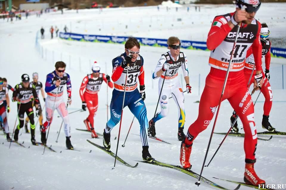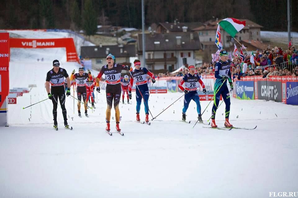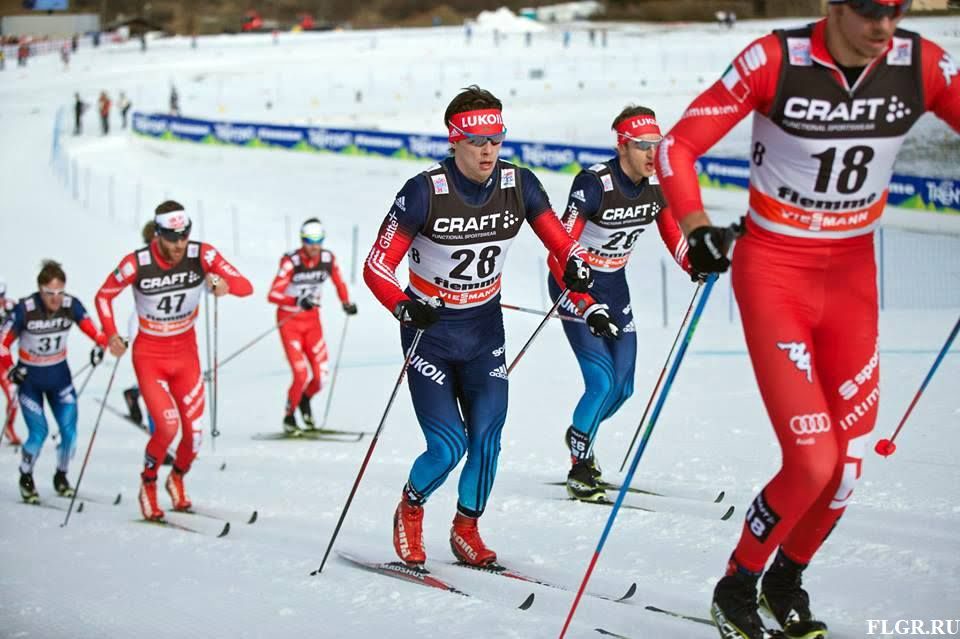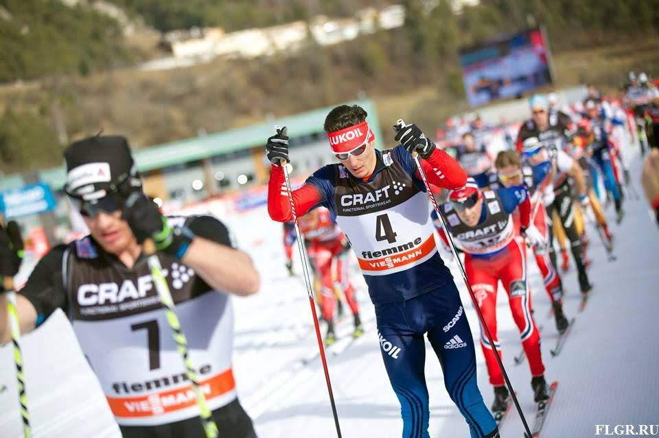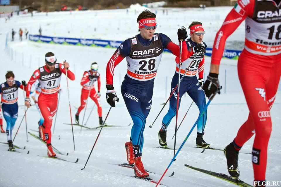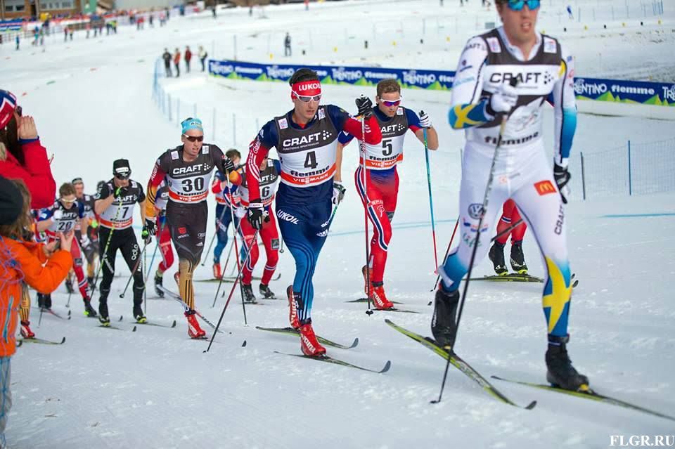 Заключительный день Тур де Ски 2015. Петер Нортуг (Норвегия) ушел на дистанцию под первым номером, под вторым Мартин Йострунд Сюндби (Норвегия), под третьим Калле Халфварсон (Швеция), под четвертым Евгений Белов.