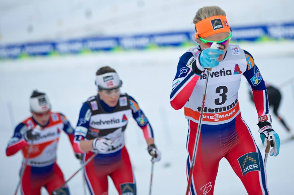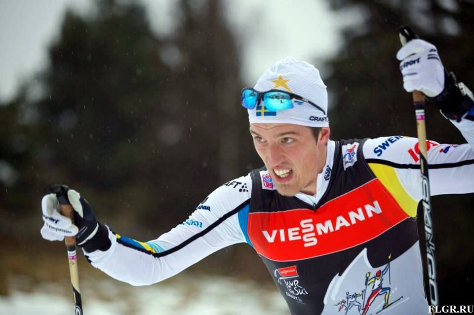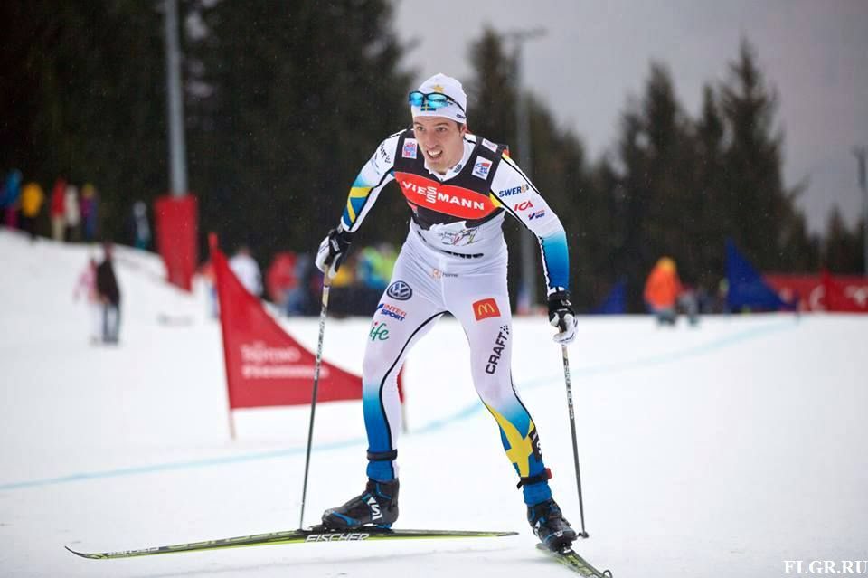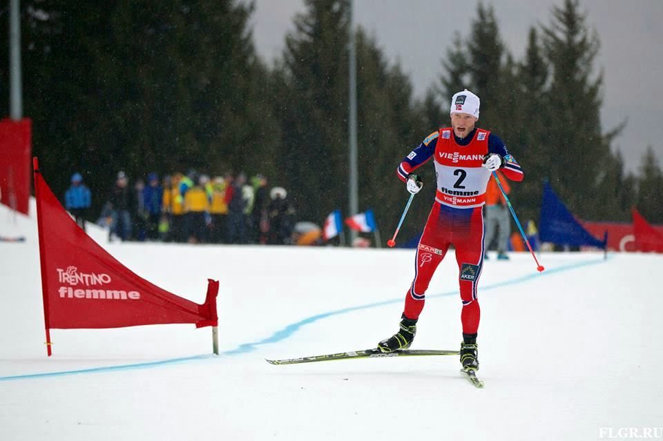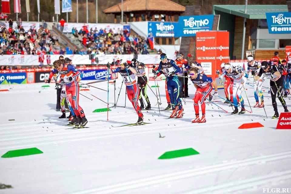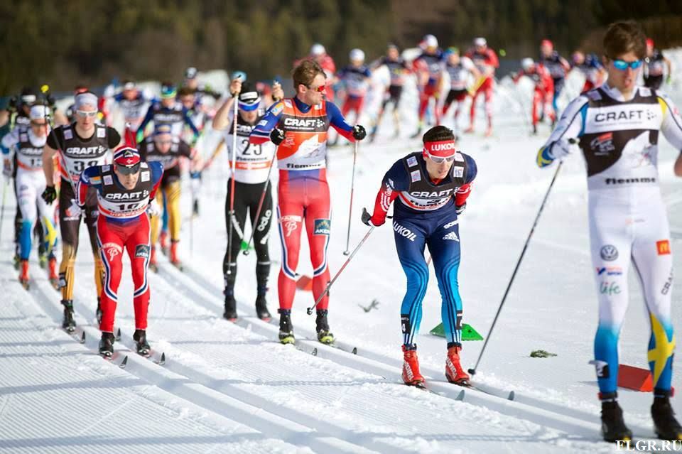 Заключительный день Тур де Ски 2015. Петер Нортуг (Норвегия) ушел на дистанцию под первым номером, под вторым Мартин Йострунд Сюндби (Норвегия), под третьим Калле Халфварсон (Швеция), под четвертым Евгений Белов.