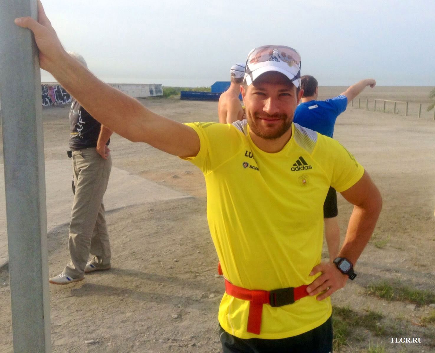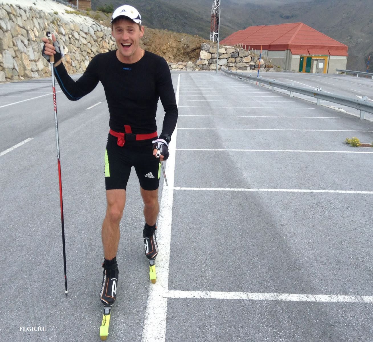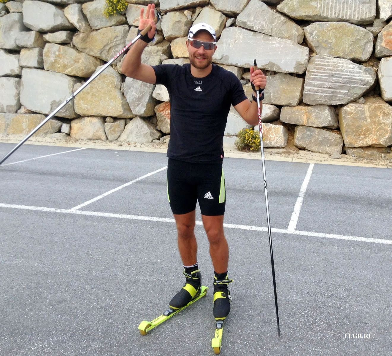 Никита Крюков во время тренировки на лыжероллерах. Тренировка проходит по обычной асфальтированной дороге, которая идет от побережья до комплекса.