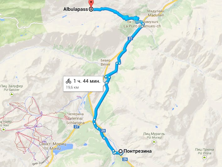 Старт тренировки от места проживания в г. Понтрезина, далее 20 км подъем и разворот на перевале Альбула. Ссылка на карту.
