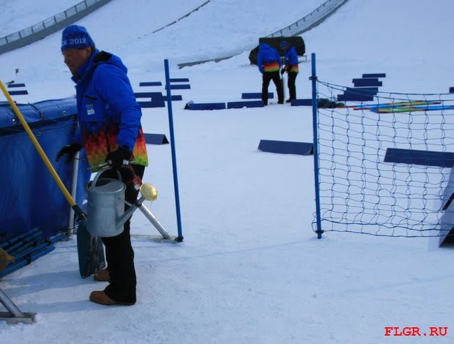 Организаторы подошли к решению этой проблемы следующим образом. Место где вытаптывается такая яма просто поливают равномерно водой из лейки, снег схватывается и замерзает
