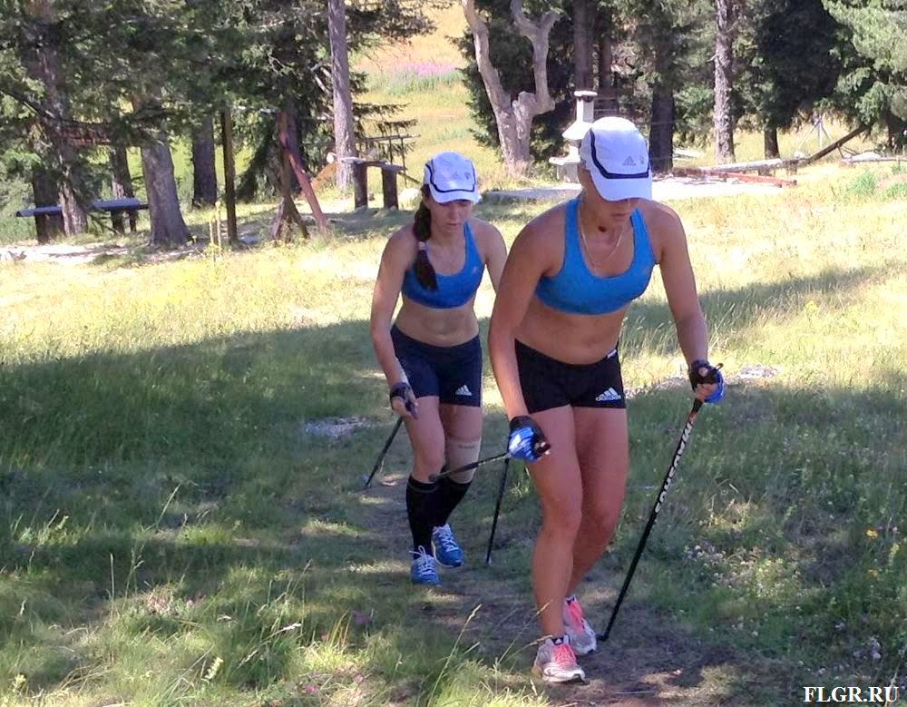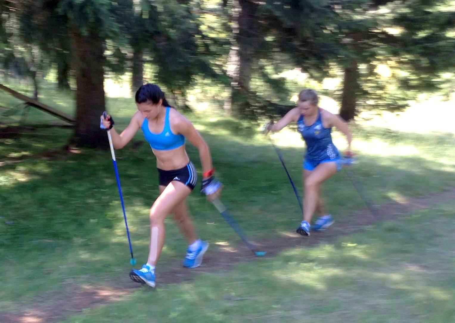 Бег с имитацией лыжного хода - важнейшая тренировка, направленная на развитие функциональной подготовки. Яна Кирпиченко (Алтайский край) и Анна Морковкина (Республика Татарстан).