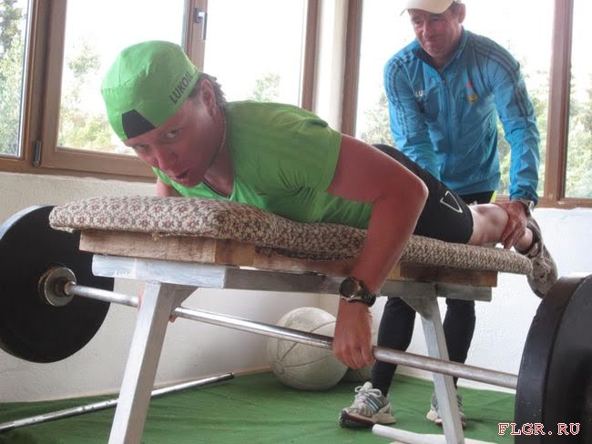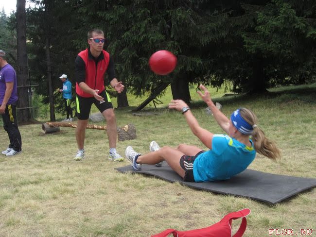 Спортсмен выполняет подъем туловища и находясь в верхнем положении бросает мяч весом около 5 килограмм ассистенту, тот в свою очередь максимально быстро бросает его обратно спортсмену. Юлия Чекалева.