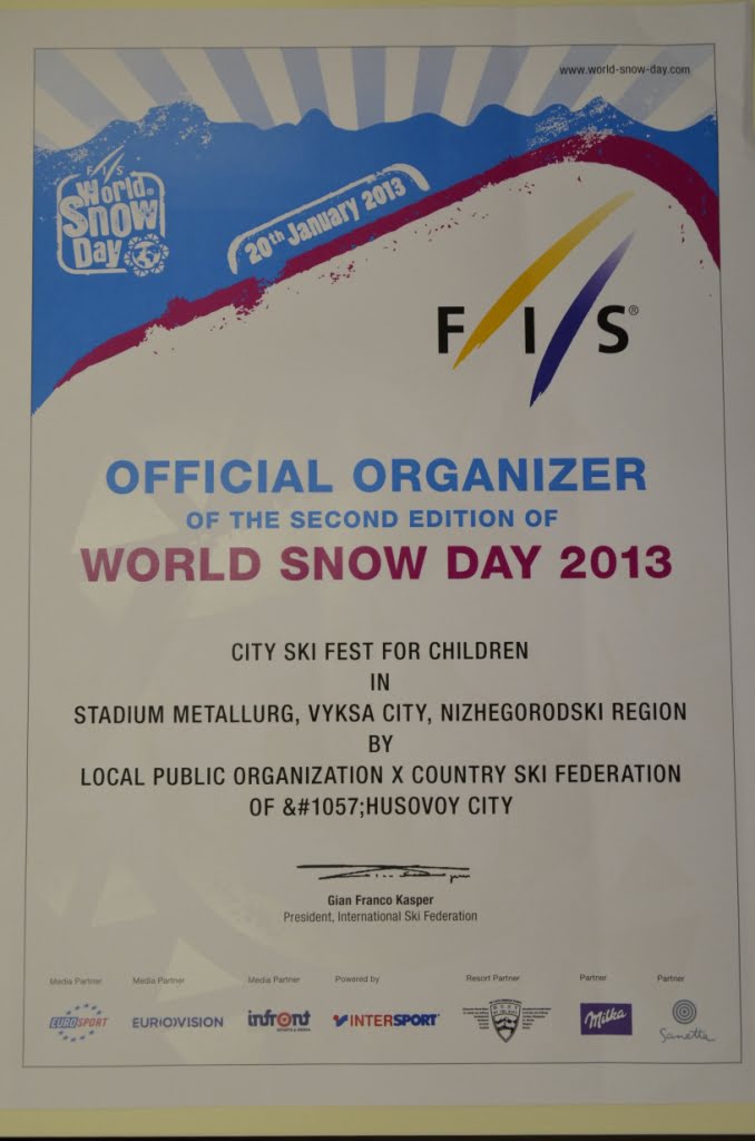 Официальное право на проведение лыжных фестивалей под эгидой проекта FIS World Snow Day Выкса получила в конце 2012 года наряду с Москвой, Сочи, Самарой, Хабаровском, Новосибирском, Пермью и Магнитогорском. Это дало возможность выполнить соответствующую подготовку и на высоком уровне провести лыжный праздник под эгидой федерации. Фестиваль получил положительную оценку FIS. Федерация отметила его насыщенную программу с семейными конкурсами, прокатом спортинвентаря, бесплатным питанием для участников и призами, а также активное участие в фестивале знаменитых российских тренеров и спортсменов, олимпийских чемпионов и чемпионов мира. На основании данной оценки в середине июля «Всемирный день снега» в Выксе получил сертификат, подписанный президентом FIS Джан-Франко Каспером. Получение сертификата закрепило статус Выксы как официальной площадки мероприятия и дало возможность участвовать в конкурсе на лучшее спортивное мероприятие FIS. Его призеры могут претендовать на грант Международной федерации лыжного спорта.